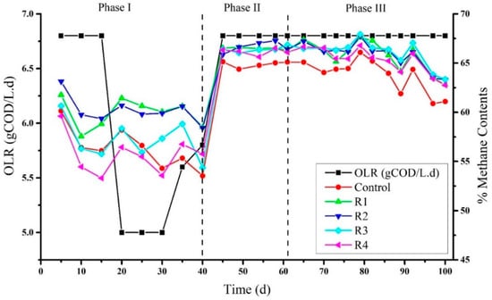 Parallel to COD removal rate, methane contents were detected on a routine basis: Methane contents after 5 days of the experiment detected were 60.12%, 61.77%, 63.13%, 60.64%, and 59.60% in the control, R1, R2, R3, and R4, respectively (Figure 2). A decrease in methane contents was observed on the fifteenth day of the experiment, although Ni supplementation had been started at their specified concentrations such as 2, 4, 8, and 16 mg/L to R1, R2, R3, and R4 respectively on day 10. Thus, feeding to the reactors was stopped for three days and then restarted with a low OLR 5 g COD L−1·d−1, and again the increase in methane contents observed on day 20 was 58.18%, 61.43%, 60.69%, 58.34%, and 56.44% in the control, R1, R2, R3, and R4. R1 and R2 generally produced higher methane contents than the control, R3, and R4. As previously investigated, the increase in methane contents was most likely due to Ni addition [32]. This is because nickel-added reactors enhance the production of methyl-coenzyme M reductase (MCR) and accelerate the methanogenic phase. Other gases like CO2 and H2 were consumed to produce more methane contents. In this study, the production of methane contents was not always concurrent and is strongly supported by previous studies [32]. Later on, due to sudden decreases in pH on day 40, feeding to the reactors was stopped to utilize the organic acids by methanogens. Furthermore, after a break of seven days when methanogens consumed hydrolytic products, the reaction was started again as a co-digestion process (molasses + RAW) and continued until day 70. The percentages of methane contents observed in phase II at day 45 in the control, R1, R2, R3, and R4 were relatively very close, i.e., 65.13%, 66.55%, 65.87%, 66.41%, and 66.34%, respectively. However, a slight increase in methane content was detected on day 65 in R1, R2, R3, and R4, rather than in control. Moreover, the highest methane content was observed on day 79 (Figure 2, phase III) in R3 (67.92%) followed by R2 (67.76%), R1 (67.59%), R4 (66.78%), and the control (66.08%). After day 79, a regular decrease in methane contents was seen in three consecutive detections, and the methane contents produced on the last day by the control, R1, R2, R3, and R4 on day 100 were 61.09%, 62.82%, 63.29%, 63.34%, and 62.67% respectively. This regular decrease in methane contents could be related to the decreased efficiency of the methanogens. Overall, during the second and third phases of the process, the methane content in the control was lower than the nickel-supplemented reactors. Nevertheless, no obvious difference was observed among different concentrations of nickel. A study conducted by Aresta et al. (2003) found the synergistic effect at the maximum concentration of 16.08 mg/L of nickel on the enhancement of methane content in the biogas [34]. In another study where cattle dung was used as a substrate, Ni supplemented batch reactors’ enhanced biogas and methane contents in the biogas [35]. During the digestion of poultry excreta, the addition of NiCl2 did enhance biogas production but did not affect methane content [36]. Moreover, Ni’s supplementation did not improve the methane content while digesting mango wastes in a pilot-scale anaerobic digester [37].