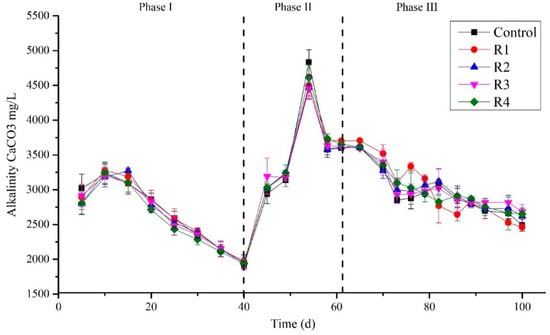 Alkalinity was measured periodically at the interval of 5 days (Figure 3). The results showed that on day 5 (phase I), the alkalinity detected in mg/L was 3018.43, 2889.94, 2803.79, 2916.02, and 2807.01 in the control, R1, R2, R3, and R4, respectively, which was then followed by a slight increase and ranged from 3182.30 to 3278.92 mg/L on day 10. A continuous decrease in the alkalinity was observed after day 15, even after Ni’s addition except in the control. The process was continued to day 40 and the lowest alkalinity observed at day 40 was 1923.45, 1972.23, 1956.32, 1923.45, and 1943.081 mg/L in the control, R1, R2, R3, and R4, respectively. This decreasing trend in alkalinity could be due to the suppression of methanogens in the sludge that cannot consume the reactors’ accumulated volatile fatty acids (VFAs). This could also be due to molasses’ mono-digestion, which can suppress methanogenic activity [22]. Li et al. (2014) suggested that alkalinity could be an adequate early warning for a stable digestion process [38]. In phase (II), after a 7-day break, the experiment started smoothly in-phase (II), and on day 45, the alkalinity detected ranged between 2940.52 and 3192.77 mg/L. This was increased abruptly on day 54, ranging 4456.53 to 4833.99 mg/L due to a break of feeding for one day. An increase in alkalinity was observed on the sixty-first day and recorded as 3601.5, 3701.43, 3620.05, 3622.23, and 3651.54 mg/L in the control, R1, R2, R3, and R4, respectively. This high alkalinity in phase II could be due to the co-substrate with molasses that increases the process’s buffering capacity. Bardi and Aminirad (2020) found that while co-digesting, food wastes (FW) and sewage sludge could lead to free ammonia, which increases alkalinity [39]. Furthermore, on day 70, after process stabilization, RAW was removed, and only molasses continued to feed the reactors as a single substrate. Again, a decreasing trend in alkalinity was observed until the last day of the experiment in all reactors and the control despite Ni’s supplementation at various concentrations (Figure 3). A decrease in alkalinity was detected in the study of Li et al. (2019) with the increase in OLR to 4.0 g VS/L·d that lead to an increase in VFA along with the reduction in pH [40]. After supplementation of TEs, the total alkalinity was not turned over to its stabilized state, and at high OLR, the TEs could not maintain the stable system [40]. One reason could be the high load in our study, i.e., 6.8 g COD/L·d, due to which Ni affects the process’s stability. Similarly, Jiang et al. (2012) digested vegetable waste in a laboratory-scale (4 L) digester and determined that an optimum concentration of trace elements could increase process stability at 2 g VS/(L·d). However, no effects of TEs were detected when high OLR 3 g VS/(L·d) was applied [41].