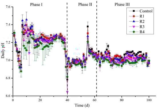 The significance of pH values represents digesters’ status, and microbial communities’ stability has been commonly considered [42]. Variation in pH during the digestion process is shown in Figure 4. At the beginning of the experiment, a decreased pH trend could be attributed to using destabilized sludge from the first experiment. Another reason could be the overload of the feed, which led to the accumulation of organic substances and rapidly converted to organic acids, resulting in the lowering of pH. However, in this situation, feeding was stopped for three days to allow methanogens to utilize the organic acids and maintain the pH [43]. The OLR was decreased to 5 g COD/L·d. By this approach, pH was maintained again up to day 39, suitable for methanogenic activities. In this duration, the methanogenic stage dominated, and the organic acids produced in the acidogenic stage were consumed, and eventually, pH values increased and tended to be stable [44]. A sudden drop in the pH was detected (6.64–6.73) on day 40 in all treatments and control due to unknown reasons. However, it could be concluded from this phase that nickel does not affect the pH stability, since our results strongly oppose the findings of Zhang et al. (2019), who stated that the addition of Ca+Ni could enhance the acid–base buffering capacity [45].