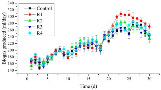 Moreover, Tian et al. (2017) found that high biogas yield would occur after 20 days of the experiment [32]. While in our experiment, the first peak was observed on the twenty-third day of the experiment. From this point, Ni2+ has a positive impact on the daily biogas production at 2 mg/L. However, later on, a decrease in biogas production was observed. This could be attributed to the decrease in stability parameters such as alkalinity and pH.