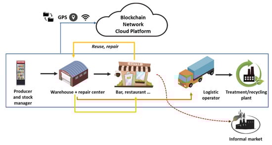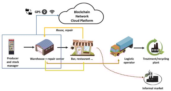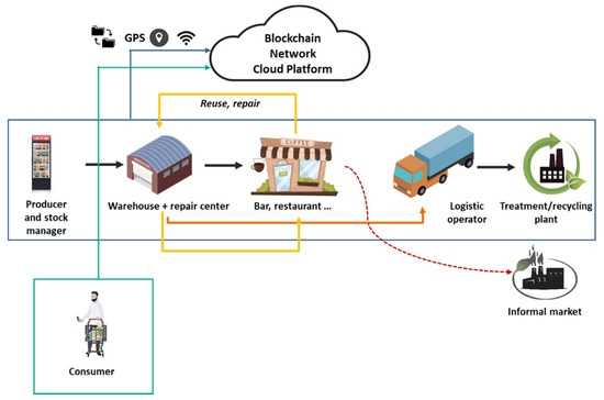 Distributed Ledger Technology (DLT) forms a second ingredient. It is better known as blockchain (BC)—a specific subset of DLT—and enables tracking and monitoring of incremental transactions and provenance of assets throughout their lifecycle even in an adversarial environment, where participants do not trust each other ex-ante. BC can be used to securely record and share information such as operating parameters, location, or energy consumption. Information can be stored in a decentralized way, which makes this technology a candidate to significantly disrupt the centralized regulatory compliance processes and transactions within the industry [24]. The CE can benefit from simultaneous cooperation and competition within the loop, adopting a decentralized principle of value creation and circulation as opposed to value creation and value appropriation [25]. BC can align supply chains with CE sustainability through traceability and transparency; it can make information about the origin of a product, processes and the parties involved in related transactions and logistics visible, traceable, and verifiable by all those in the supply chain, thus supporting the application of sustainability criteria for the selection of suppliers, vendors, materials, and products, as well as the design of more sustainable logistics networks and internal operations [26,27]. Therefore, a BC-based documentation of the product history increases transparency in the supply chain for CE, providing information at the point of sale to build trust and security regarding transactions between the involved parties. Moreover, in the waste management sector, BC is expected to help in overcoming deficiencies of the current Extended Producers Responsibility (EPR) system, mainly due to the missing connection between the actual product sold by original equipment manufacturers in the market and the product recovered by the final processor [28]. Furthermore, it can be a source of intelligent accounting and verification systems in future applications [10,29,30].