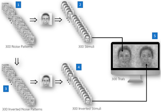 Each noise pattern was inverted, finally obtaining a set composed of 300 pairs of noise patterns (the initial pattern and the inverted one). Finally, every noise pattern was superimposed on the base face image, producing 300 pairs of different noisy versions of the base face (Figure 2). In each pair, one image is obtained using a noise pattern and the other one using the corresponding inverted pattern.