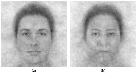 The outcomes of the NBRC task performed in this study are shown in Figure 3. These faces are psychologically meaningful images that represent the PF (and the anti-PF) that the participants in the task used to match the perception of a prototypical PM. Therefore, the PF shows the features of the faces that drive the judgment and can be considered an estimation of the participants’ mental representation of a face that fits a PM. In the same way, the anti-PF image shows the features of the face that do not drive the sensation of a PM’s face [51]. A visual inspection of the faces in Figure 3 shows significant differences in some facial features (the nose, the eyebrows, and the mouth) and even the contour of the jaw.