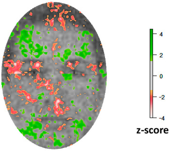 Clusters of pixels that significantly influence the stimuli classification. Green zones correlated positively with PF classification. Red and white zones correlated negatively.