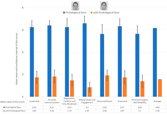 The complete set of scores obtained in the second phase of this work is available in Appendix A (Table A1) and the means, the standard deviations, and the confidence intervals of the scores for each competence given to the PF and the anti-PF are presented in Table A2. The t-values of the dependent-samples t-tests (α = 0.05) are shown in the last column of the same table. There were significant differences in all the competences between the faces (p < 0.05). These results are summarized in Figure 5.