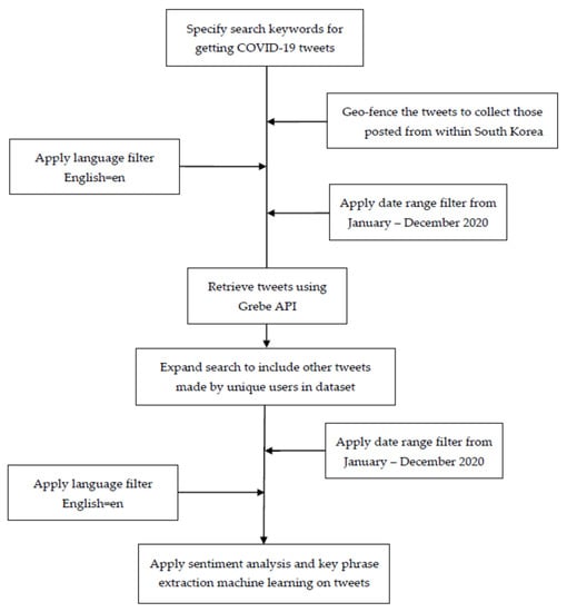 In order to analyze the sentiments of foreign students and educators, a sampling of the population was taken from Twitter’s publicly available tweets. After data collection and filtering, the collected tweets were analyzed for expressions of emotions. An outline of the steps from data collection to analysis is presented in the flowchart in Figure 1. Data was collected in two phases: keywords and users. We have provided our dataset as open source to other researchers via GitHub: https://github.com/DS-Titi/SKCovid-Edu.