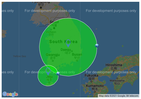 Grebe currently has over 28 million indexed public tweets from Canada, and has been leveraged by other researchers for text mining in social media for identifying city-wide events [27], investigating how public, organizations and health care professionals in Alberta, Canada express wellness in relation to children [28], and for exploring the effects of urban design on mental health [29]. For our research, both phases of data collection were implemented with Grebe, including all applied filters. Hence, Grebe was repurposed to collect tweets with South Korea as the geo-filter and the additional filter of tweet language set as English in order to target foreigners tweeting from within the country. The geo-filtering parameters used in Grebe are illustrated in Figure 4. Essentially, the centers and radii of the bounding circles around the overlays on the area of South Korea are used as inputs to Grebe for filtering tweets based on reported longitudes and latitudes of the tweets when available.