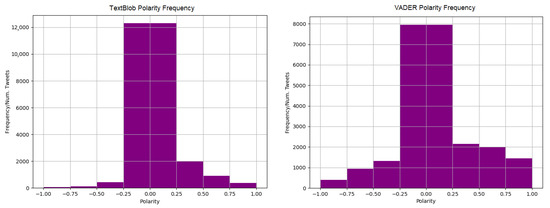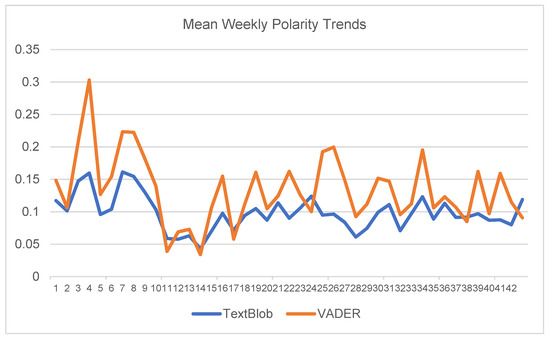 VADER is a rule-based sentiment analyzer which utilizes pre-labeled lexical features in addition to the semantic orientation of a given text to compute the probability that the sentence is expressing positive, negative, or neutral emotions [32]. In addition, VADER provides a compound score by summing valence scores of all words in the lexicon, and normalized as a range between −1 and +1, equivalent to TextBlob’s polarity score.
