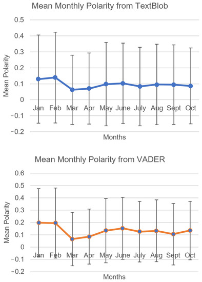 The trend of polarity over time observed from within our collected dataset is summarized in Figure 7, which also provides further insight into the variance in sentiments via error bars. The results are congruent with Figure 6 and show that polarity was more positive-leaning overall. This can be observed in both the TextBlob and VADER pre-trained sentiment analyzers.