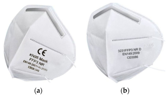 Figure 3a shows an example of a respirator that declares its filtration and protection capabilities according to two different standards. The first line shows the CE marking corresponding to the designation of the notified body (notified person). However, the four-digit numeric code is not given. The second line of the nameplate shows the filtration efficiency KN95, which corresponds to the Chinese standard defined by the norm GB2626-2006. According to this standard, filtration efficiency of at least 95% is declared. The third line contains the data FFP3, which corresponds to the European standard EN 149-2001 + A1. According to this information, the user could rightly expect an efficiency of at least 99.95%. This expectation is more intense because the number of the European standard is given, while the Chinese one is not mentioned. Figure 3b shows the letter and number code KN95 on the right side of the respirator. Even in this case, the data FFP3 is mentioned. This mark corresponds to the European standard EN 149-2001 + A1. However, the designation of the standard for this type of respirator is questionable because it is not given in full. Thus, for both types of respirators, there is conflicting information regarding the level of provided protection. It is very likely that too much effort to maximize profits has led the manufacturer of the respirators in the picture to artificially raise the level of protection from FFP2 to FFP3. If the manufacturers indicated an FFP2 level that corresponds to the declared KN95 level according to the Chinese standard, the potential buyer of these respirators would probably not know anything.