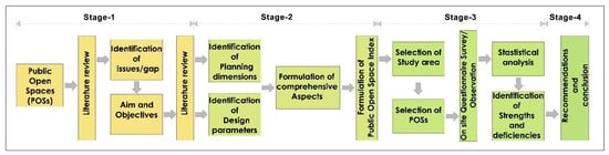 The study focuses on two POSs. These POSs are public parks, offer free access to users and are located in the city of Nagpur. For the assessment, the study proposed the Public Open Space Index (POSI) that combines five aspects: Individual well-being, Inclusiveness, Engagement, Sustainable spaces, and Management. The study adopted a mixed approach, including a self-administered questionnaire survey and site observation for data collection. A total of 553 visitors from both POSs participated in the main survey. The study helps planners, designers, and parental authority to develop initiatives to make these limited POSs inclusive, functional, sustainable, and contribute to improving the quality of life of users. Figure 1 shows a schematic representation of the methodology adopted for the study.