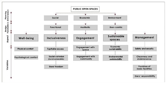 The first aspect, Individual well-being, relates to functional, aesthetic, and user-centric parameters and social dimension. Well-being is defined as a state of happiness, health, relaxation, and a comfortable lifestyle [41,42]. In terms of POS, a human desire causes people to visit POSs that provide them with physical and psychological comfort. Here, comfort refers to a state where space promotes physical and psychological relief and satisfies human needs through the provision of convenient physical conditions, facilities, and aesthetical features [43,44]. A well-defined and visible entrance gives comfort to users and allows them to enter the POS. Wide, single-level walkways within POS improve usability and provide physical comfort not only to joggers but also to senior citizens who prefer walking [45,46,47]. Furthermore, the climate responsive design of POS also improves physical comfort [48,49]. The open and shaded area, semi-covered seating, and shelter facilities allow users to use the space during different seasons. In terms of psychological comfort, the availability of focal points and vistas create visually appealing and pleasing views for users [43,50,51]. These elements create a perceivable and positive image of the POS between users [52,53]. Additionally, POS that receives less outside noise improves psychological comfort.