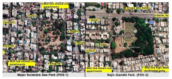 According to the information received from NMC officials, the Garden Department is responsible for the construction, operation, and maintenance of the POSs. The city included a larger number of NMC’s own free access POSs than paid access POSs. Pilot study observations indicated that paid access POSs are more maintained, clean and provide different facilities and services to users than POSs that offer free access. Some of the free access POSs were confronted with issues such as inadequate maintenance, poor artificial lighting, untidiness, debris, littering, and broken furniture and pathways. Observations also suggest that most citizens prefer to visit free access POSs for yoga, walking, exercise, and roaming as part of their ordinary routine. With the help of factors such as pilot study observations, citizens’ preference for visits and availability in higher numbers, it was decided to consider free access POSs for the main study. Two free access POSs; namely, Major Surendra Deo Park (MSDP) and Rajiv Gandhi Park (RGP) with an area of 4.97 and 8.0 acres, were selected on the basis of a specific criterion. The criterion examined area, ownership, daily footfall, and adjacent neighbourhood. Preference was given to POSs that were surrounded by commercial activity and residences from various social, cultural, and economic groups. Such diversity encouraged the researcher to cover a wide range of information in the study, such as visitation patterns, space use, users’ activities, and their perceptual opinion of space. Both POSs are normally open to the public from 5:30 a.m. to 10:00 a.m. (morning) and from 4:30 p.m. to 8:30 p.m. (evening). Figure 3 shows the location of both POSs. In addition, Figure 4 shows both POSs and their surrounding area.
