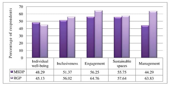 First, describing aspect wise result; both POSs received ‘poor’ rank in Individual well-being aspect. Here, MSDP and RGP earned 48.29% and 45.13%, respectively. Whereas, both POSs gained ‘fair’ rank in Inclusiveness and Sustainable spaces aspects, in these aspects, MSDP scored 51.37%, and 55.75% and RGP received 56.02% and 57.64%, respectively. RGP scored ‘average’ rank in Engagement and Management aspects. Here, RGP received 64.76% and 63.83%, respectively. MSDP got ‘fair’ rank in Engagement and ‘poor’ rank in Management by getting 56.25% and 44.29% respectively. Next, describing the total POSI score (i.e. summation of all five aspects scores), MSDP and RGP earned 50.67% and 57.30% with a ‘fair’ ranking. The overall result shows that there is a need for improvement in both spaces. Figure 5 indicates the aspect wise POSI score received by both POSs. In addition, the POSI score received by both POSs is shown in Table A1 in Appendix A.