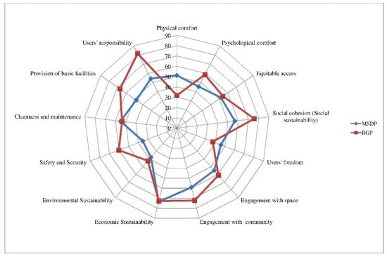 Results now describe the variable wise score obtained by POSs. In the individual well-being aspect, MSDP achieved a high score in the ‘physical comfort’ variable. The variable assessed the capacity of POSs to provide convenient entry, walkways, open and shaded areas, arrangement of seating, and shelter. It also checked whether all age groups used the space effectively or not. In the same aspect, RGP gained a high score in the variable ‘psychological comfort’. It assessed the availability of elegant architecture and landscape features, attractive and pleasant views. The variable also evaluated the availability of noise buffer zone in combination with planting vegetation in order to reduce outside traffic noise that gives users peace, ease, and pleasure. Simultaneously, in the aspectInclusiveness, both POSs received almost equal scores in the variable ‘equitable access’. The variable evaluated the potentiality of POSs to promote diversity and Universal Design. In the same aspect, RGP received a high score in ‘social cohesion’. It assessed whether or not POSs provided opportunities for users to participate in various events and programmes, encouraged positive conversations, shared experiences, a sense of community, and a sense of pride.