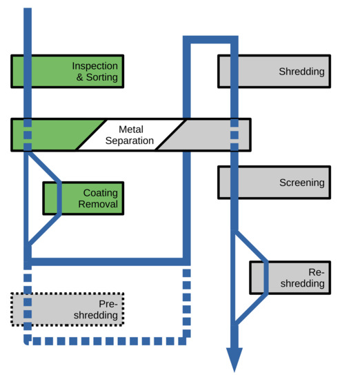 Inspection and separation is the simplest to address (27), metal separation needs special attention due to possible automated execution (28), and coating removal has its own equation as well due to its uncertain nature (30).