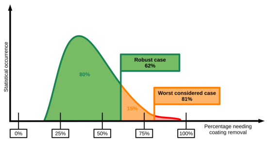 The cumulative probabilities can be translated into material ratios, based on the probability density functions constructed by estimating the distribution from statistical data. Figure 2 shows such a probability density function for coating removal. Aiming for 95% and 80% probabilities, this translates to 81%, and 62% of materials needing coating removal in the worst considered and robust cases, respectively. A separate function is created for each delivery category, and for both coating removal and re-shredding.
