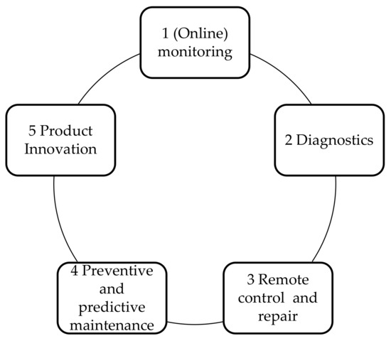 Possible solutions for smart services based on the results of Klein’s case studies (2017) [60] include the following: professional assistance via remote connection during commissioning, data transmission via remote connection, i.e., data transfer to/from products, data storage, e.g., automatic backup and storage of data, system updates via remote connection, e.g., automatic software updates of offered products, remote classification of conditions, i.e., remote monitoring of conditions and analysis of products offered, predictive services, e.g., prediction of events based on data and proactive initiation of service interventions. According to qualitative research from electrotechnical manufacturers [61], the following smart services were identified: remote monitoring, control, and diagnostics, remote repair, and preventive and predictive maintenance (see Figure 1).