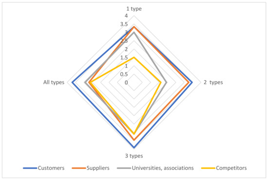 In general, companies offering a wider portfolio of services tend to involve a broader portfolio of business partners from universities or associations, as well as competitors, in their collaboration (see Figure 3). The range of services that includes services related to the highest values of the degree of cooperation of partners are monitoring, preventive maintenance, and remote repair. Together, these services generate higher average scores than all services in the portfolio offered.