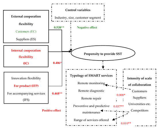 Hypothesis 1 (H1): The higher the ratings given by companies for cooperation flexibility with external customers, the less chance they provide smart services. Thus, for companies that evaluate cooperation with external customers less, we can expect the provision of smart services with a higher probability. As a result of innovation of the product, the influence of smart services on the evaluation of cooperation with external customers has been confirmed (p < 0.5), but it is negative. The higher ratings given by companies for external cooperation flexibility with suppliers are likely to positively influence the propensity to provide smart services by SMEs in the electrotechnical industry. However, we did not identify any significant effect (p > 0.1), so Hypothesis 1 is rejected.