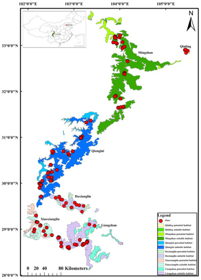 - Yang, H.B.; Andres, A.; Tang, Y.; Zhang, J.D.; Wang, F.; Zhao, Z.Q.; Liu, J.G. Range-wide evaluation of wildlife habitat change: A demonstration using giant pandas. Biol. Conserv. 2017, 213, 203–209. [Google Scholar] [CrossRef]