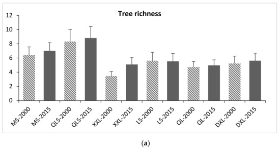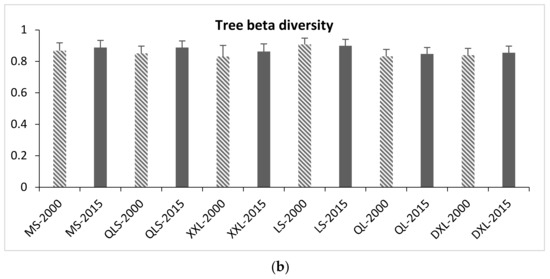 Tree richness (a) and tree beta diversity (b) in six mountain sites in 2000 and 2017. MS, Minshan Mountain; QLS, Qionglai Mountain; XXL, Xiaoxianglin Mountain; LS, Liangshan Mountain; DXL, Daxianglin Mountain.