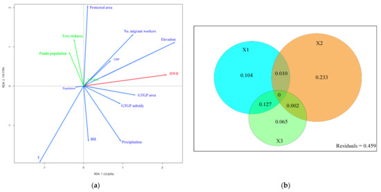 Ordinate plot from the redundancy analysis (RDA) of changes in human well-being and the conservation status of the giant panda habitat and their relationships with policy factors, socioeconomic factors, and environmental factors (a) and variance partitioning revealed the contribution of the variables (policy factors, socioeconomic factors, and environmental factors, and the residual variance) to the changes in human well-being and the conservation status of the giant panda habitat (b). GTGP, Grain-to-Green Program; HWB, human well-being; T, temperature; HII, human influence index; policy factors, X1; socioeconomic factors, X2; environmental factors, X3.