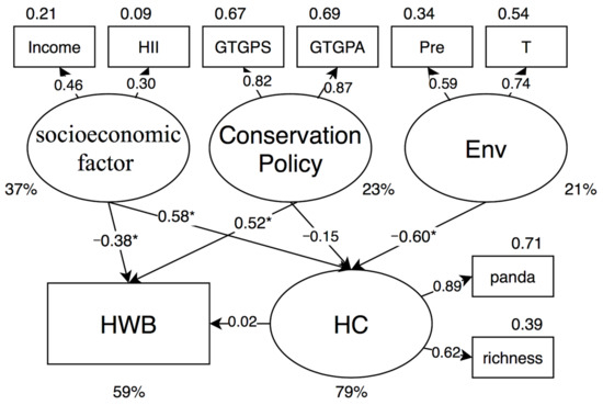 Structural equation model (SEM) depicting the effects of policy, socioeconomic, and environmental factors on the changes in human well-being and the conservation status of the giant panda habitat in Giant Panda National Park (GPNP; df = 45, p = 0.13 > 0.05; standardized root mean square residual (SRMR) = 0.047 < 0.050). *, significant direct effects (p < 0.05). HWB, human well-being; HC, the conservation status of the giant panda habitat.