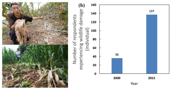 (a) Tangjiahe residents farmland in Minshan damaged by wild boar, takin. (b) Number of respondents experiencing wildlife damage in 2000 and 2015.