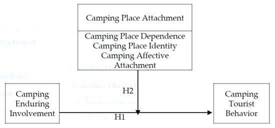 Enduring involvement in a leisure activity means the individual has pay attention and engage in a specific activity for long time []. Enduring involvement directly determines tourists’ judgment of tourism activities []. Previous studies in tourism indicate that tourists’ involvement is one of the antecedents of behavior []. Tourists’ actual behaviors are determined by their behavior when campers are involved in camping and are satisfied with the leisure activities, which in turn leads to enhanced camper behavior. This study proposed the following hypothesis: