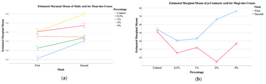 The plots showed that malic acid from MC mushrooms supplemented with calcium silicate (Figure 1a) showed higher values of this organic acid, and a further increase from the first to the second flush, which was positively correlated with the increasing percentage of calcium silicate. Malic acid is an important carboxylic acid with beneficial effects on health [12,25]. Its values in the mushrooms increased with the increase of calcium silicate supplementation. It seems that a supplementation with 0.5% of calcium silicate favors the production of malic acid, especially in the first flush. Still, supplementation of 4% does not seem to increase the amount of malic acid in the first flush when compared to supplementation with 0.5%, but greatly stimulates its production in the second flush. With regards to the phenolic compounds, once again, a significant interaction was detected for all, both for MC and PP mushrooms. Of the main compounds detected, protocatechuic acid was the most abundant, followed by p-coumaric acid and finally cinnamic acid, which was the least abundant. The EMM plots in Figure 1 allow for some general tendencies, namely that for MC, supplementation with 4% shoed higher amounts of malic acid, while the control sample showed the least (Figure 1a), while the first flush showed higher values of p-coumaric acid with an increase related to the highest supplementation percentages, while for the second harvest this tendency was inverted (Figure 1b). Still, for PP, the second harvest showed higher values of p-coumaric acid, being this increase correlated with higher supplementation of calcium silicate (Figure 1c). Cinnamic acid, the least abundant phenolic compound showed and EMM plot for PP in which the highest amount was sought for the second harvest, that showed a maximum of this phenolic compound at 1% of supplementation with calcium silicate (Figure 1d).