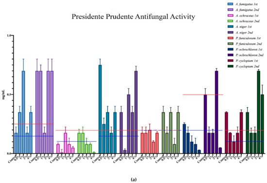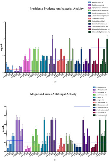 The minimum inhibition concentration (MIC) for the antimicrobial activity of the different mushrooms is represented in Figure 3, where each microorganism corresponds to a colour, and all of the different supplementation results are expressed within that same colour. Furthermore, the minimum inhibition concentrations of the positive controls are represented in each case through the red and blue horizontal lines.