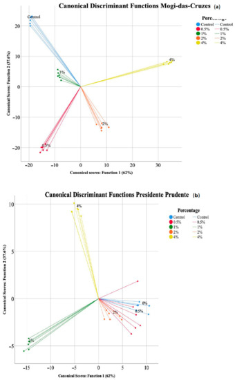 Linear discriminant analysis (LDA) of the different calcium silicate supplementation percentages for each mushroom, (a) Mogi-das-Cruzes and (b) Presidente Prudente.