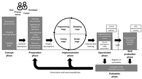 As one can see, by using VR, engineers can accelerate the design and testing of their products. VR technology is also becoming part of industrial practice, which is being used not only to educate workers but also to create workplaces that are compatible with the new Operator 4.0 paradigm such as augmented operator, virtual operator []. Research interviews conducted with Industry 4.0 representatives showed that they see great potential in these solutions but perceive a big problem in their implementation in the production environment. The lack of a well-defined framework or methodology for planning the implementation process, estimating its costs and duration, holds back the decision to implement VR technology in the education and training processes inherent in modern industrial systems. Thus, a key issue in the context of wider application of VR in the field of industry-oriented education is the development of an appropriate methodology for the implementation of VR courses into the enterprise practice in order to increase the efficiency of the educational process and organize the stages of course preparation according to the requirements of the enterprise. The works partially addressing issues in this area are mainly conducted in academic centers. The paper [] presents a simplified teaching methodology for VR practical courses in engineering education. This work presents methods and means for creating VR courses but omits the stage associated with adapting the created course to the environment’s requirements to be simulated. Using VR in the educational cycle, which includes creating architectural objects, is presented in the paper []. The described simplified methodology is dedicated to one type of solution, i.e., the design of architecture in urban planning.