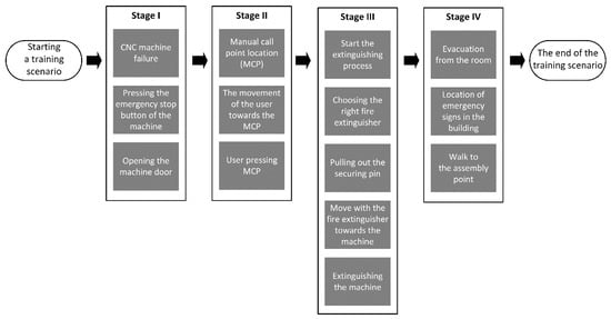 The training’s main didactic goal is to develop repeatability and high efficiency of safety activities related to fire extinguishing of a manufacturing station based on a computerized numerical control (CNC) machine. As part of the conceptual phase, a general description presenting the training process outline was created. This description included the following content: