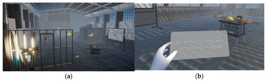During the experiments, all participants were standing. It was possible to move participants through the so-called teleportation. The training was divided into four stages, each related to selected aspects of safety and user behavior in case of their occurrence (Figure 2). As part of VR technology initiation, stage zero (participant preparation) was available for users. This was training during which the user learned the principles of movement in the controller’s VR and operation. To verify the effectiveness of the training, it was used to measure each of the four main stages by its participants. In this way, it was possible to verify how users cope with the execution of individual exercises and the entire scenario. Participants had the basic knowledge of VR, but until the training, did not use it actively. Each of the participants had to perform the entire exercise in one round, without changing the stages during the training and without prompting by the instructor. Their knowledge of the operation and implementation of individual actions were based on prompts implemented in the application, messages over the left hand/controller and information board.