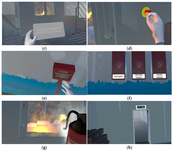 Selected elements of the VR environment dedicated to training for extinguishing an existing fire: (a) view of the production area; (b) elements of the trainee’s protective equipment; (c) machine failure and initial fire phase; (d) machine emergency shutdown; (e) manual fire alarm activation; (f) fire extinguisher selection; (g) extinguishing a machine fire; (h) elements of evacuation signage.