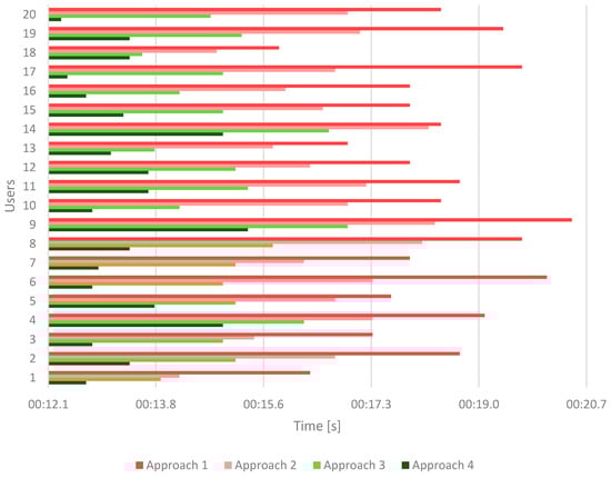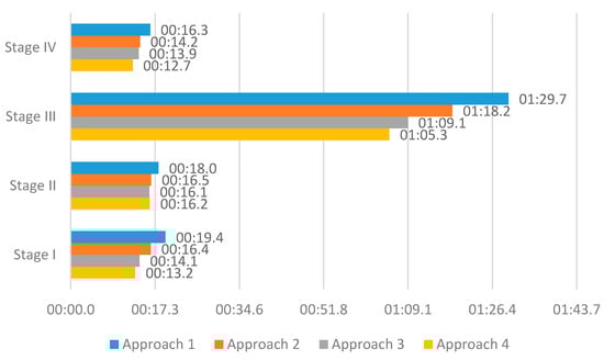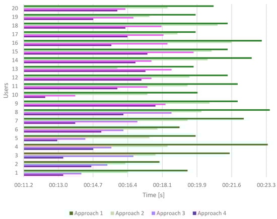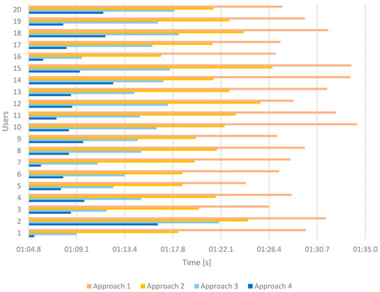 Figure 5 shows the effects of training in the time domain for each participant’s approach to realize tasks prepared for them in the first stage (stage I). For the individual graphs, it was assumed that the vertical axis represents the individual participants and the horizontal axis indicates the time to perform a given stage in each of the four approaches. As can be seen, there is a significant difference in time between completing the task in the first, second and third approaches. This is due to the knowledge of what awaits the user in a given stage. In the second attempt, it can be seen that the participant knew what to expect and gained knowledge about the actions to perform to move on and the efficiency in their implementation. Differences between the second and third attempts are also noticeable, as is the time difference between the first and second attempts. In the third approach, the user becomes more skilled and familiar with the VR around him.