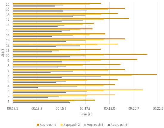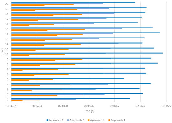 As can be seen in Figure 4, the time in each approach differs from the one before. The scenario’s mentioned knowledge influences the next approach’s given result and better familiarity with the VR controllers. The training showed that the participants performed much better in the subsequent approaches. Thanks to practical training, they had the possibility to extend their knowledge and acquire new skills in a more effective way than in the case of purely theoretical classes.