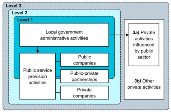 City-OLCA framework according to [13]. Level 1 considers public service provision by city-owned companies. Level 2 considers public service provision by contracted companies. Level 3 considers activities beyond public service provision.