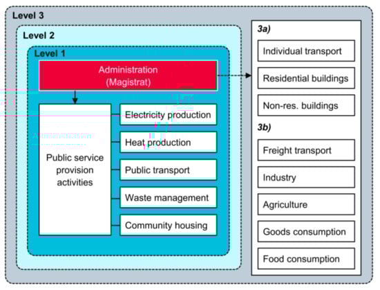 The city-OLCA framework according to [13] distinguishes between four assessment levels (Figure 1). Level 1 considers activities related to the public service provision by city owned companies. Level 2 also includes public service provision by private companies. Level 3 considers (a) activities indirectly influenced by administrative decisions and (b) all other activities taking place within the city boundary. A detailed description of the framework and methodological background can be found in [13]. In the following section, this framework is applied to the case study of Vienna.