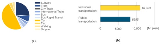 Personal transport demand data for Vienna for 2016: (a) Modal split based on person-km, (b) total personal transport demand for individual and public transportation in million person-km. Values according to [23,24,25].