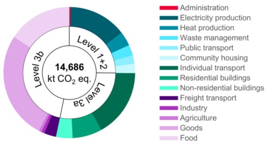 Results show a total of 14,686 kt CO2 eq. for Vienna’s 2016 baseline (Figure 4). This equals approximately 8 t CO2 eq. per capita. Over one half (53%) of city-wide GHG emissions can either directly or indirectly be attributed to the local government (up to level 3a). The other half (47%) is beyond governmental responsibilities (level 3b). Within level 3b, food and goods consumption account for the largest parts (91%). Freight transport, industry, and agriculture account for the rest (9% of level 3b).
