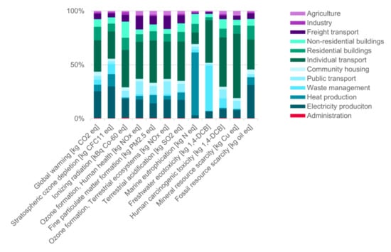 Regarding global warming, all activities are driven by the operational stage (use-phase). The supply with electricity and heat or the burning of fuels “outperform” embodied emissions from the production stage. Two examples shall be representative here. Taking all building types together, emissions from producing the buildings amount to approximately 159 kt CO2 eq. (or 8%, respectively). Emissions from the production of passenger cars for individual transportation (in Figure 6a) amount to approximately 553 kt CO2 eq. (or 21%, respectively). However, the dominating stage shifts with different impact categories.