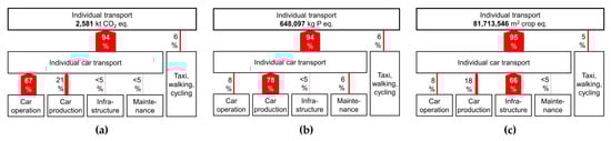 Individual transportation process contribution (driver tree) for (a) global warming, (b) freshwater eutrophication, and (c) land use. Width of red arrow shows relative contribution to the respective indicator. A hotspot shift from the operation of cars (in a) to the production of cars (in b) and to the production of infrastructure (in c) is clearly visible.