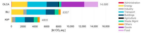 Our results are 43% higher than the national GHG inventory for Vienna (BLI) [15] and 67% higher than Vienna’s own GHG monitoring scheme (KliP) [14]. For better comparison, we grouped the city-OLCA activities according to the sectors covered in both references (Figure 7). Especially food and goods consumption cause city-OLCA results to exceed the references by up to a factor of 3.