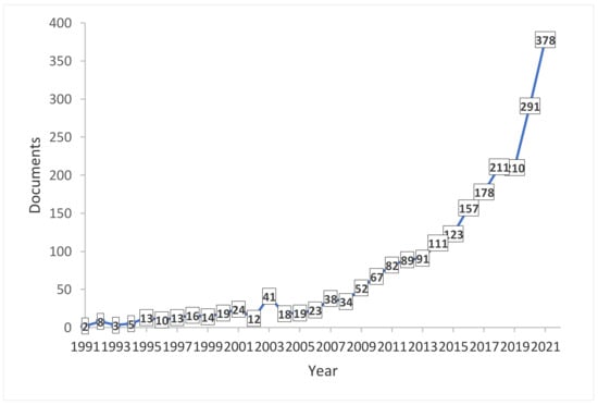 The search query retrieved 1974 documents for the time period between 1990 and 2020. The number of publications over the last three decades in this field has been increasing at an exponential rate, with the slope being even steeper in the last few years. The number of documents for the years 2018, 2019, and 2020 was 211, 210, and 291 respectively (Figure 1)