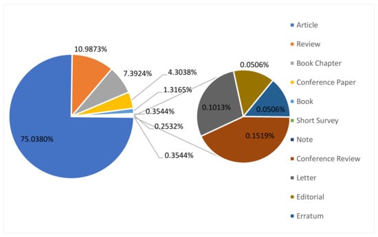 The expected number of documents for the year 2021 was predicted on the basis of linear regression, with 87 documents having been published in the first twelve weeks of 2021, which approximates to 378 for 52 weeks. The retrieved documents were mainly research articles (n = 1482; 75%) followed by review articles (n = 217; 11%) and book chapters (n = 146; %) (Figure 2). This hints at the fact that the type of published research in agroecological and related fields is original research work hence the increasing spread of agroecological interventions can be deduced. In total, the search returned documents in fourteen different language with English clearly being the main language of communication (n =1823; 92.35%), with Spanish, Portuguese, French, and Chinese being distant next in line languages of communication with 53, 46, 39, and 20 documents to their name respectively.