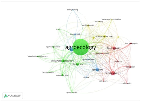 A total of 5438 different keywords were linked to the documents that the search returned. In order to narrow down the number of keywords to a meaningful minimum, a threshold was established. Only keywords with a minimum number of occurrences of a greater or equal to 19 were included for the visualization: only 29 passed the threshold. In Figure 3, the top 29 keywords are visualized as a network map with the help of VOSviewer software (trial version) from the Centre for Science and Technology Studies, Leiden University, The Netherlands [33]. The following network visualization gives an idea about the research papers published in the time period 1990 to 2020, whose subject area lay at the intersection of the topics of agroecology, sustainable development, food security, and climate change.