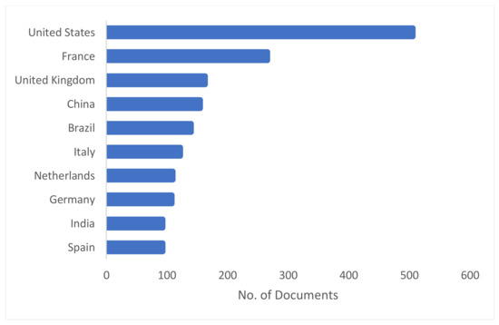The bibliometric search returned published documents from at least 138 countries, from East Timor to Yemen and Afghanistan to Peru, with a total of 34 documents being of ‘undefined’ source (nationality). The top 10 countries based on the published research output in the research fields under consideration are presented in tabulated form, with the US topping the list with 506 documents, followed by 266 documents from France, and 163 from the UK (Figure 4). The search results returned with 50 countries with at least 10 documents. These numbers point to a widespread understanding and application of agroecological methodologies for food security in the backdrop of climate change in almost every country of the world.